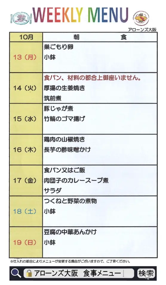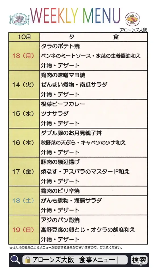 食事メニュー【10/13~10/19☆週間メニュー】2025<アローンズ大阪>