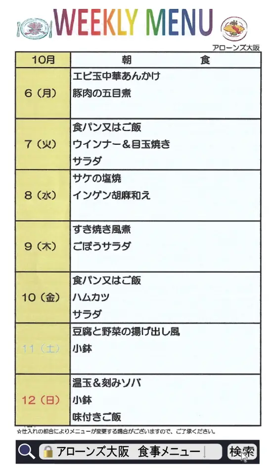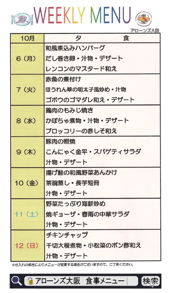 食事メニュー【10/6~10/12☆週間メニュー】2025<アローンズ大阪>